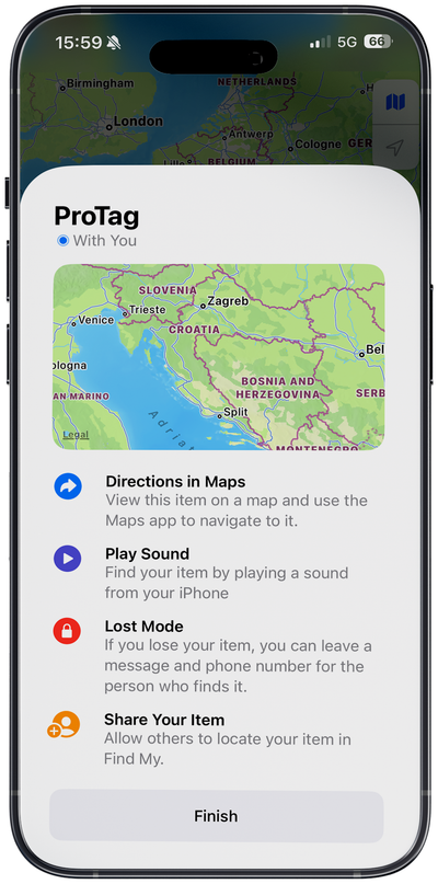ProTag supports all standard Find My features for tracking and alerts.